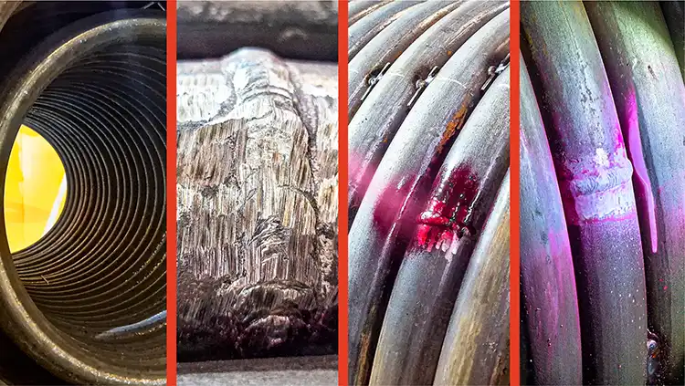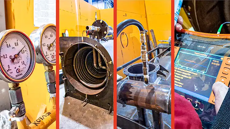 Длина змеевикового теплообменника термомасляного котла может достигать до 60 метров. Сборка теплообменника происходит по частям — сначала трубы укладываются в длину и провариваются между собой. На этом этапе после проведения сварочных работ проходит визуальный контроль соединений, а также контроль цветной (капиллярной) дефектоскопией.