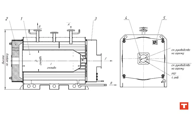 Также, на водогрейных котлах присутствуют патрубки для опорожнения котла от воды, и патрубок для отвода дымовых газов в основную дымовую трубу.