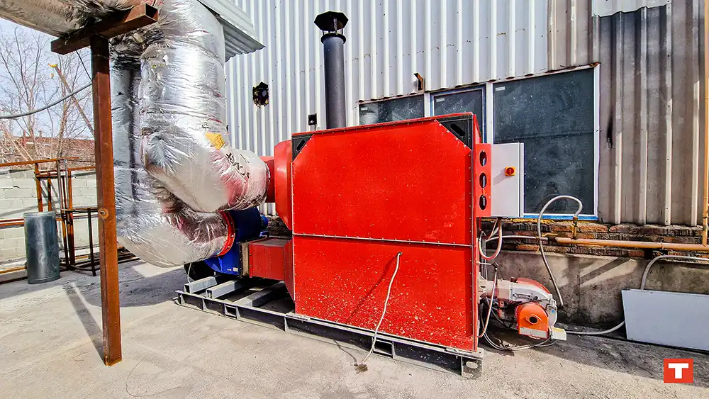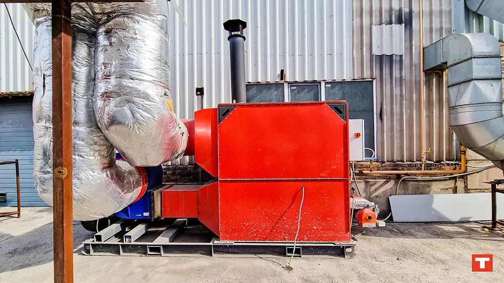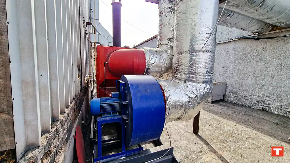В короткие сроки теплогенератор был подключен к газовой магистрали, а в помещении была смонтирована линия воздуховодов вдоль одной стены. В настоящее время дополнительно ведутся работы по монтажу разветвлений воздуховодов от данной ТГВО в другие здания, стоящие рядом.